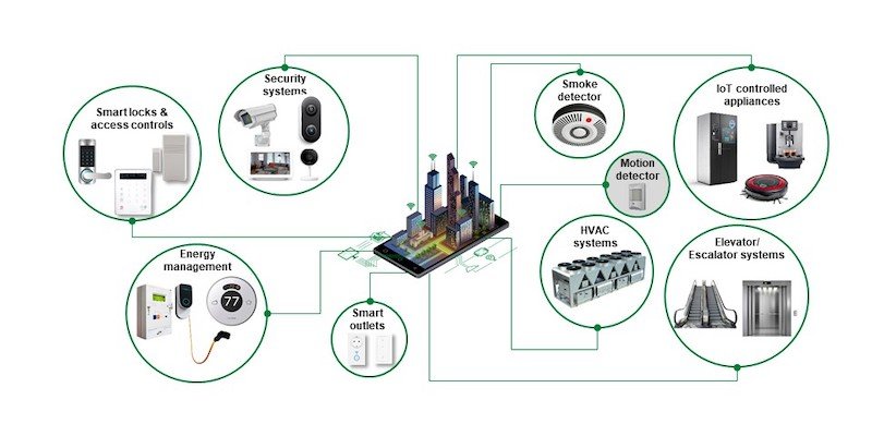 Las casas y edificios inteligentes se benefician de tecnologías inteligentes que les permiten ser más convenientes, más seguros y energéticamente eficientes. La Figura 1 muestra la amplia gama de productos disponibles tanto para hogares como para edificios. Estos productos pueden ser monitoreados y controlados automáticamente por los consumidores en sus hogares y el personal de administración del edificio.